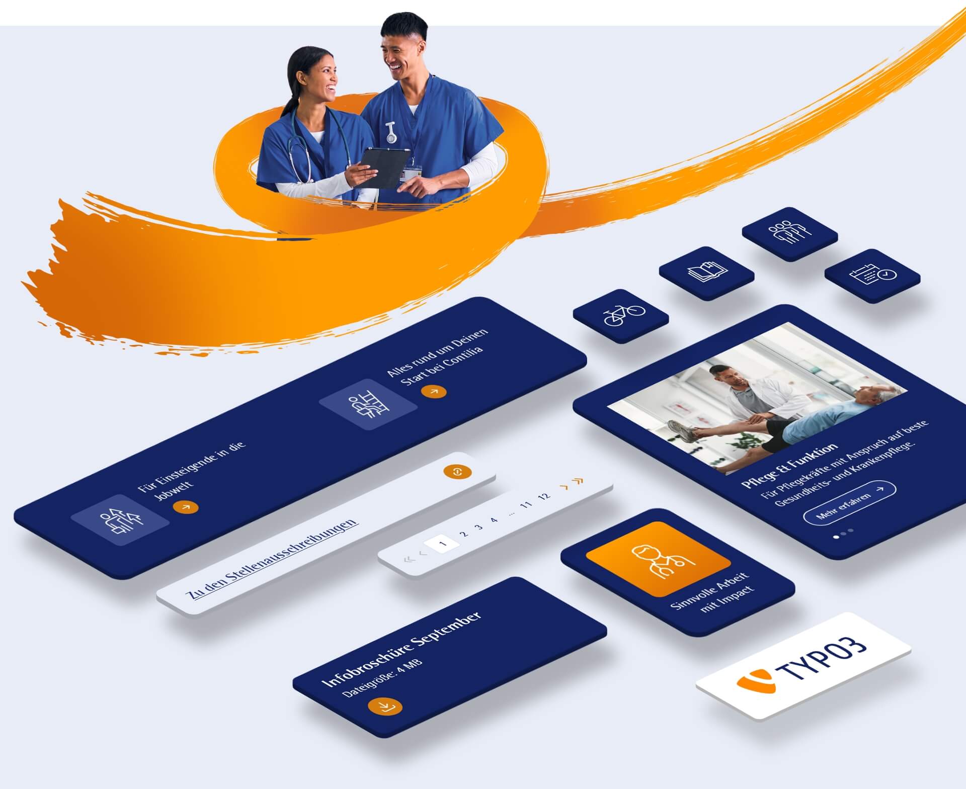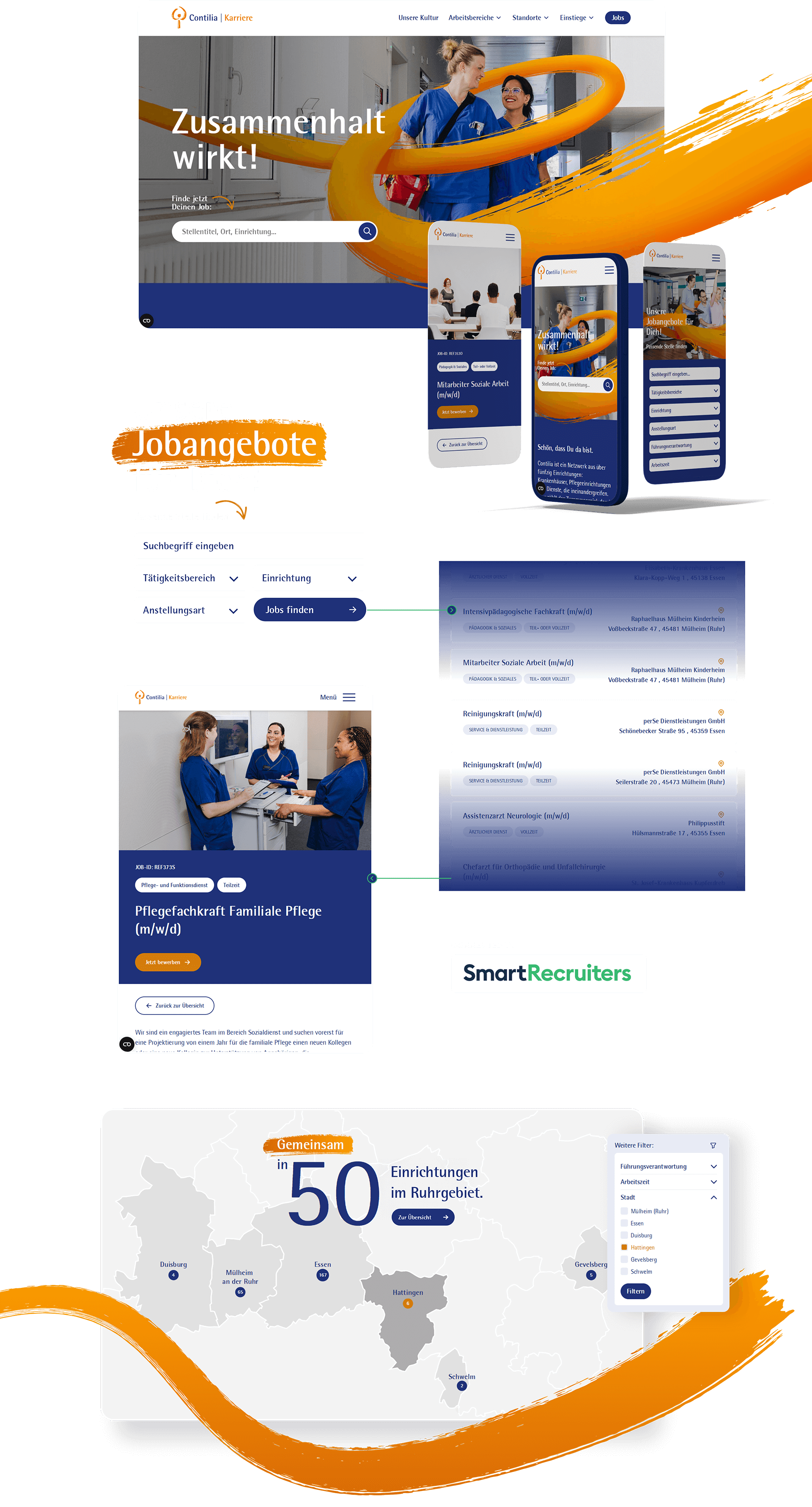 Das modulare TYPO3-Baukasten-System bildet die digitale Basis für das HR-Team von Contilia und unterstützt die Ansprache zukünftiger Mitarbeitender im Sinne des Employer Brand „Zusammenhalt wirkt". Durch den modularen Aufbau ist das System besonders skalierbar und flexibel: Neue Einrichtungen, Landingpages für Recruiting-Kampagnen oder spezielle Aktionen lassen sich problemlos einbinden, während Inhalte von den zuständigen Redaktionsteams eigenständig gepflegt werden können.