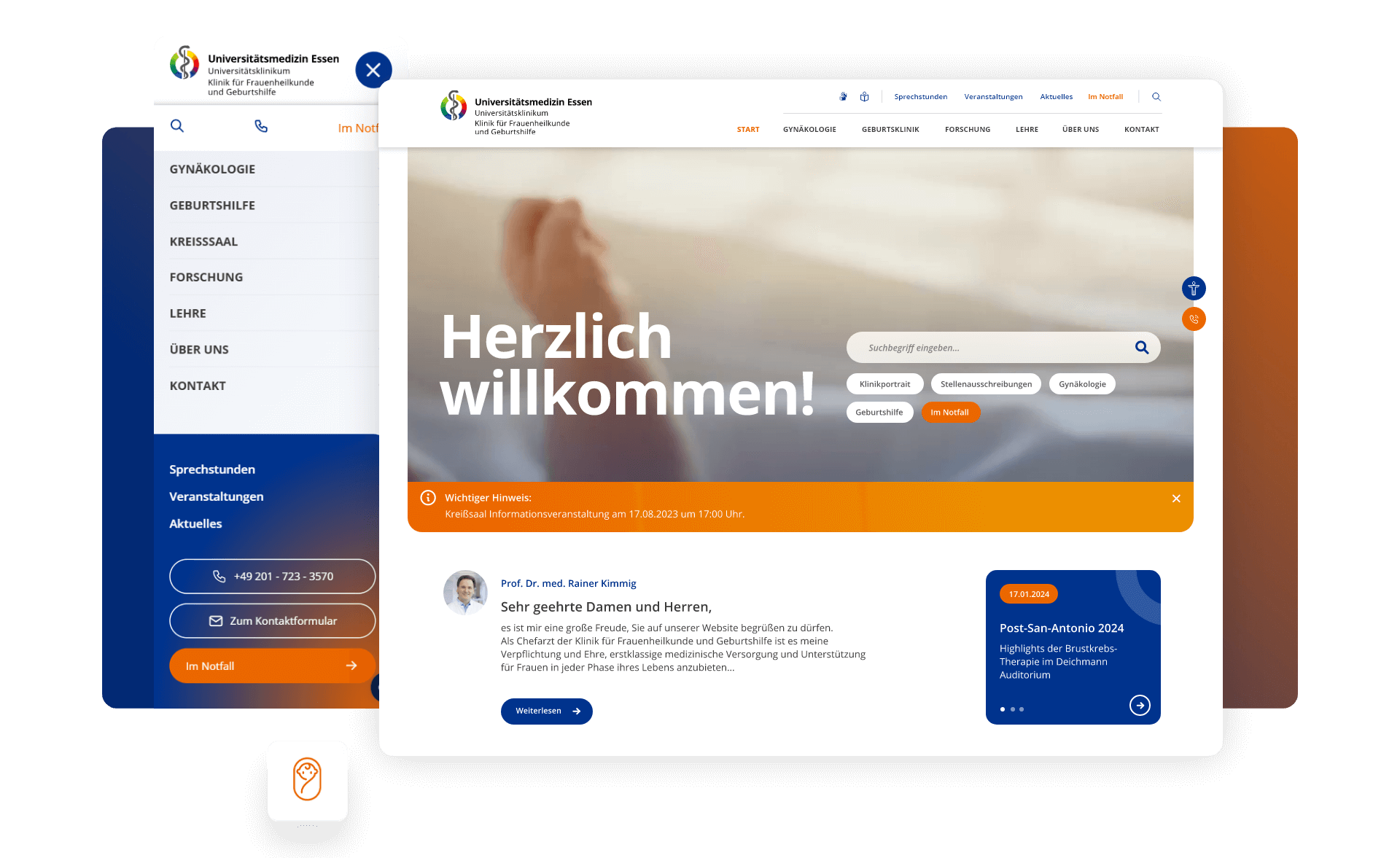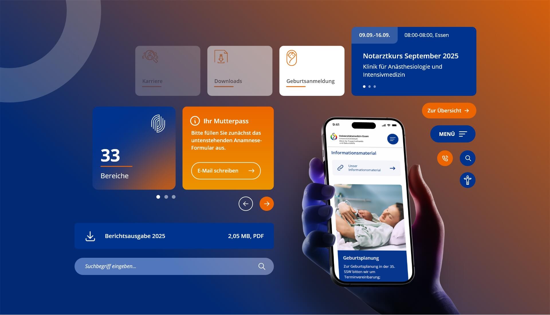 Für die Universitätsmedizin Essen haben wir 2024 die zweite Generation der modernen digitalen Plattform für Kliniken und Institute auf TYPO3-Basis gelauncht. Die Plattform spricht alle Zielgruppen direkt an: Nutzende finden ohne Umwege die Inhalte, die für sie relevant sind, während sie gleichzeitig als zentraler Hub für Informationen rund um die Einrichtungen dient und durch Online-Services Prozesse für alle Beteiligten effizienter gestaltet.